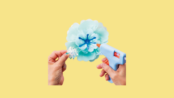 ⑤ ③の中央に画用紙のお花のパーツ、キラキラモールの順にグルーガンで貼る。
