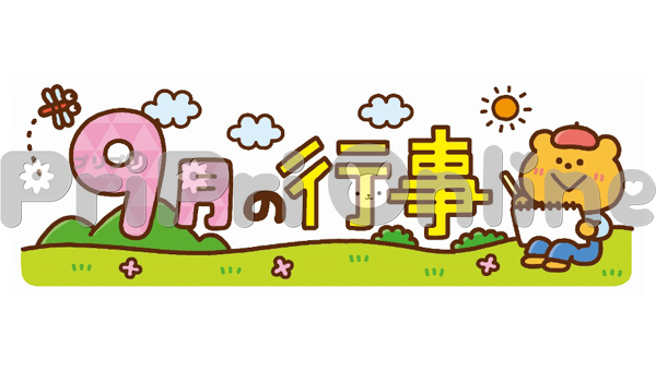 風景のスケッチをする動物と「9月の行事」の飾り文字