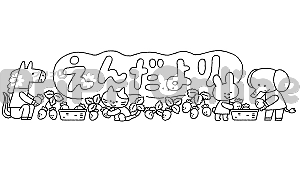 イチゴと動物たちと「えんだより」の飾り文字(白黒)