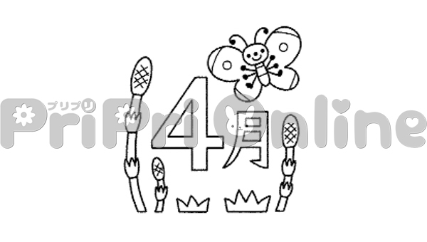 つくしと蝶と「4月」の飾り文字(白黒)