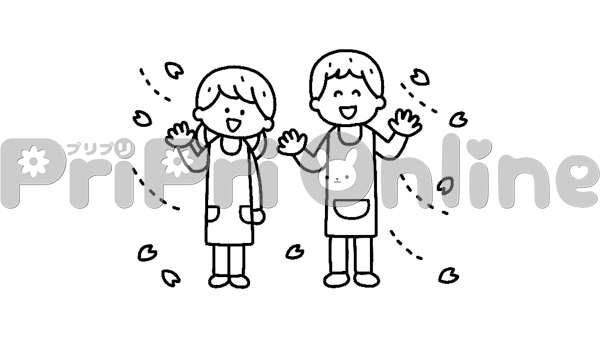 手を振る保育者たちのイラスト(白黒)
