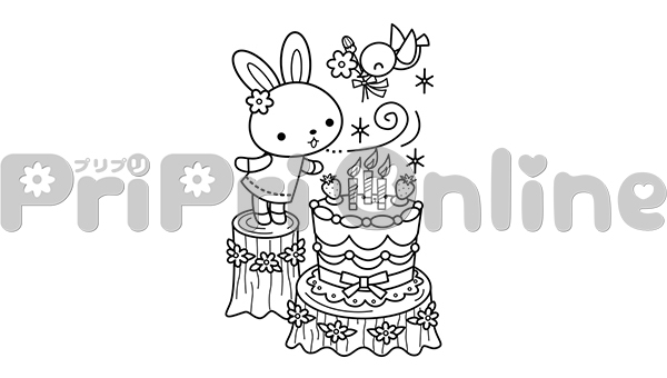 ケーキのろうそくを吹き消すウサギのイラスト(白黒)