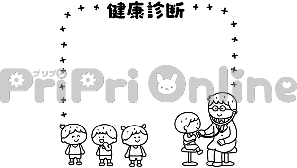 順番を待つ子どもたちと「健康診断」の飾り枠(白黒)