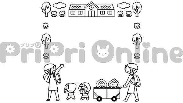 防災訓練をする子どもと保育者の飾り枠(白黒)