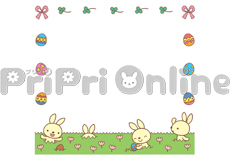 イースターエッグを探すウサギたちの飾り枠(白黒)