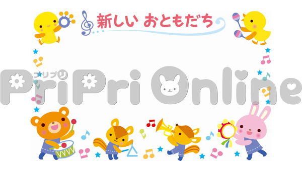 楽器を演奏する動物たちと「新しいおともだち」の飾り枠