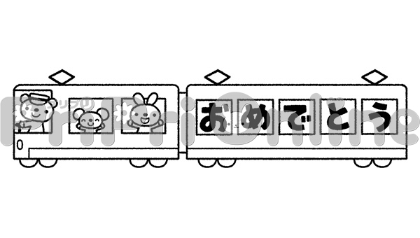 動物の乗った列車と「おめでとう」の飾り文字(白黒)