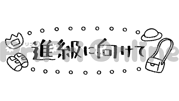 新年度用品と「進級に向けて」の飾り文字(白黒)