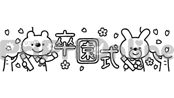 卒園証書を持つ動物たちと「卒園式」の飾り文字(白黒)