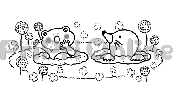 モグラとカエルと綿毛のイラスト(白黒)