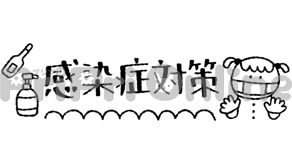 マスクをした子どもと「感染症対策」の飾り文字(白黒)
