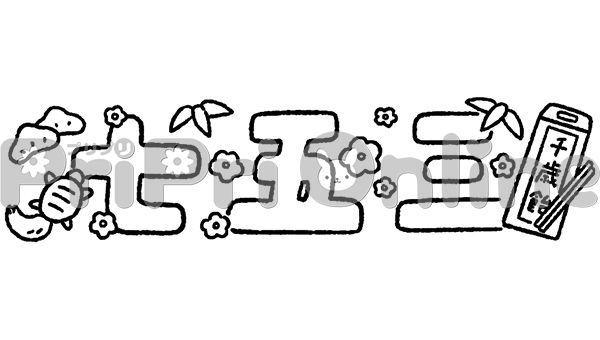 千歳飴や亀のイラストと「七五三」の飾り文字(白黒)