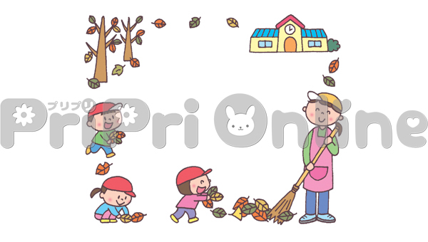 落ち葉を集める子どもたちと保育者の飾り枠