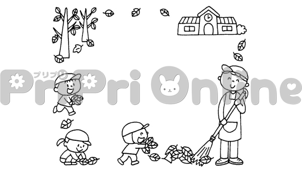 落ち葉を集める子どもたちと保育者の飾り枠(白黒)