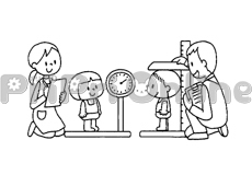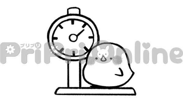 体重を測るヒヨコのイラスト(白黒)