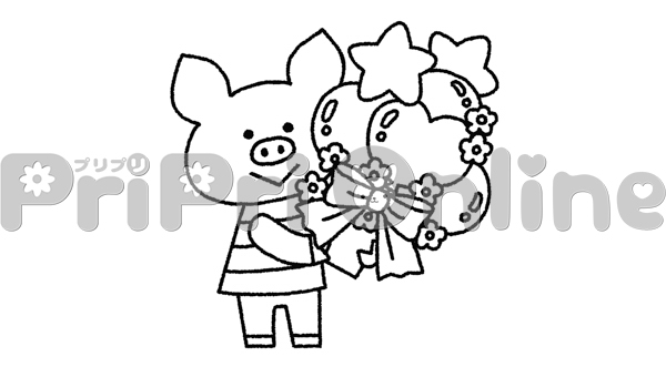 バルーンの束を持ったブタのイラスト(白黒)