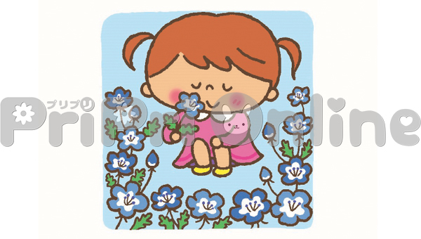 ネモフィラの香りを嗅ぐ女の子のイラスト