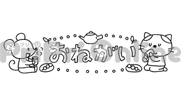 お茶する動物たちと「おねがい」の飾り文字(白黒)