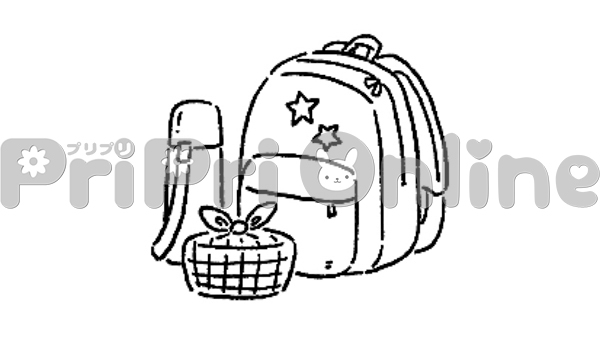 遠足のお弁当と水筒とリュックのイラスト(白黒)