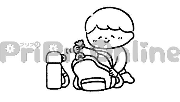 遠足の準備をする男の子のイラスト(白黒)