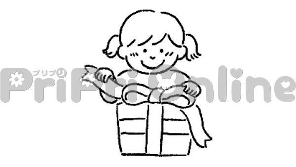 プレゼントを開封する女の子のイラスト(白黒)