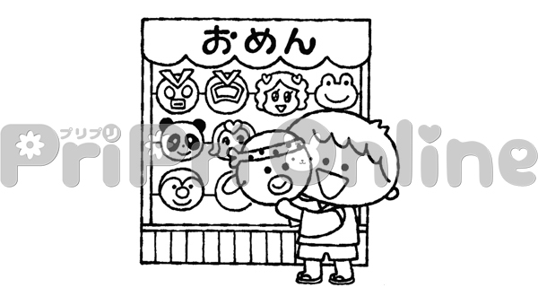 夏祭りでおめんを手にする男の子のイラスト(白黒)