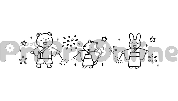 浴衣で手持ち花火を楽しむ動物たちのイラスト(白黒)