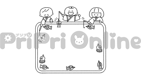 夏祭りで魚釣りをする子どもたちの飾り枠(白黒)