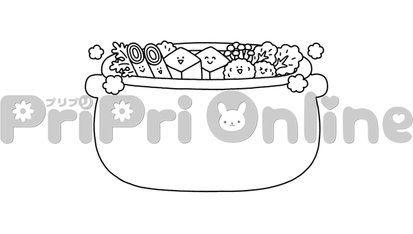 野菜、豆腐、つくねなど入った鍋の飾り枠(白黒)