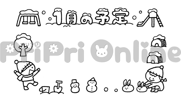 雪の公園で遊ぶ子どもと「1月の予定」の飾り枠(白黒)