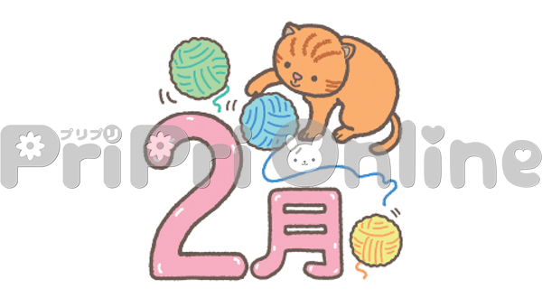 毛糸で遊ぶ猫と「2月」の飾り文字