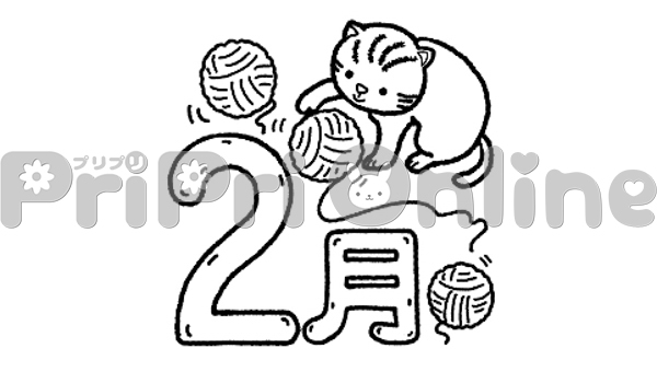 毛糸で遊ぶ猫と「2月」の飾り文字(白黒)