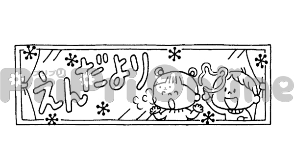 窓に絵を描く子どもと「えんだより」の飾り文字(白黒)