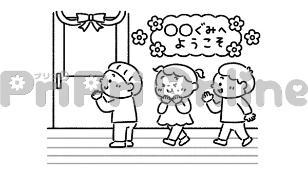 進級したクラスへ向かう子どもたちのイラスト(白黒)