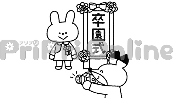 卒園式で記念写真を撮る動物たちのイラスト(白黒)