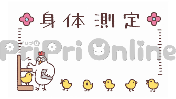 身長を測るニワトリとヒヨコと「身体測定」の飾り枠