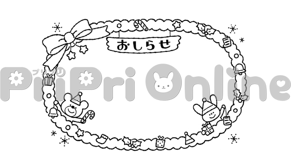 クリスマスリースと動物たちと「おしらせ」の飾り枠(白黒)