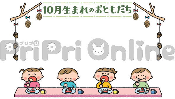 ケーキを食べる子どもたちと「10月生まれのおともだち」の飾り枠