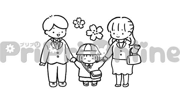 入園式に出席する子どもと保護者のイラスト(白黒)