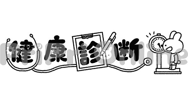 体重を測るうさぎと「健康診断」の飾り文字(白黒)
