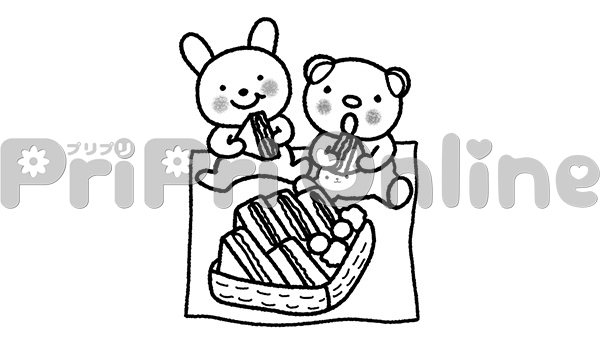 サンドイッチを食べる動物たちのイラスト(白黒)