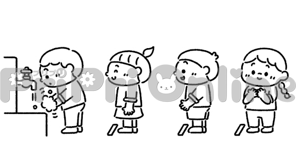 手洗いをする子どもたちのイラスト(白黒)