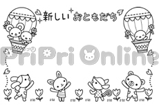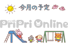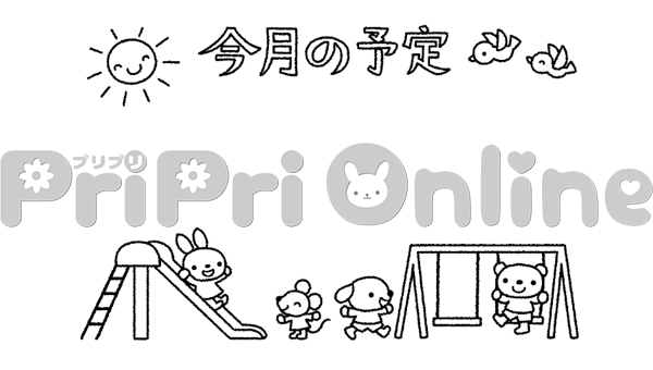 公園で遊ぶ動物たちと「今月の予定」の飾り枠(白黒)