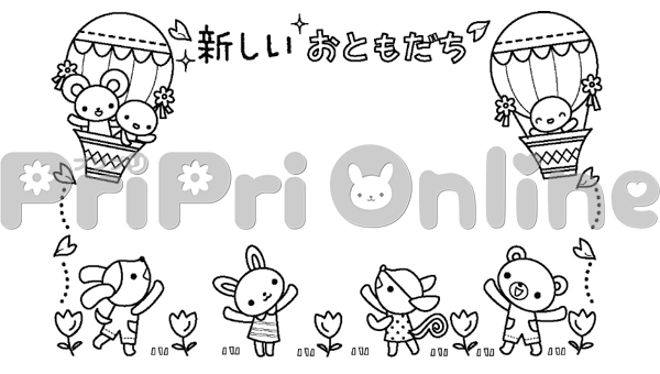気球に乗った動物たちと「新しいおともだち」の飾り枠(白黒)