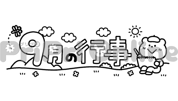 風景のスケッチをする動物と「9月の行事」の飾り文字(白黒)