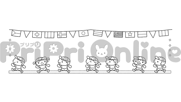 運動会をする子どもたちと国旗の飾り枠(白黒)