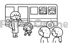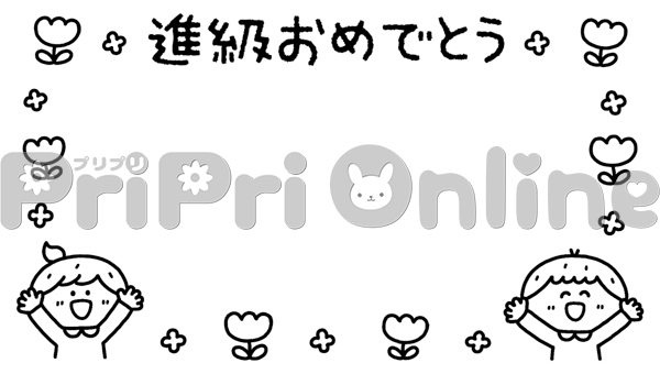 子どもとチューリップと「進級おめでとう」の飾り枠(白黒)