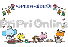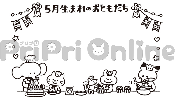 ケーキを作る動物たちと「5月生まれのおともだち」の飾り枠(白黒)