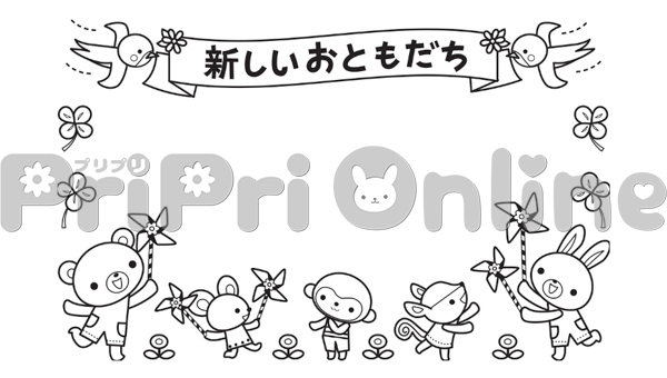 風車で遊ぶ動物たちと「新しいおともだち」の飾り枠(白黒)
