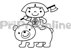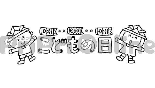 子どもたちとこいのぼりと「こどもの日」の飾り文字(白黒)